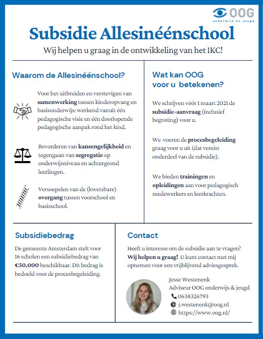 De gemeente Amsterdam stelt maximaal € 800.000,- beschikbaar voor 16 scholen (max. € 50.000,- per school) die de samenwerking met de kinderopvang willen versterken. OOG helpt graag mee met het opstellen van de subsidieaanvraag, die voor 1 maart 2021 moet zijn ingediend.